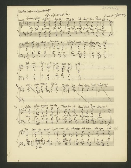 Die Spinnerin : [Volkstümliches Lied, für vierstimmigen Satz] / bearb[eitet von] Carl Goldmark. [ohne Jahresangabe]. Wienbibliothek im Rathaus, MHc-14231, https://resolver.obvsg.at/urn:nbn:at:AT-WBR-131649 / Public Domain Mark 1.0