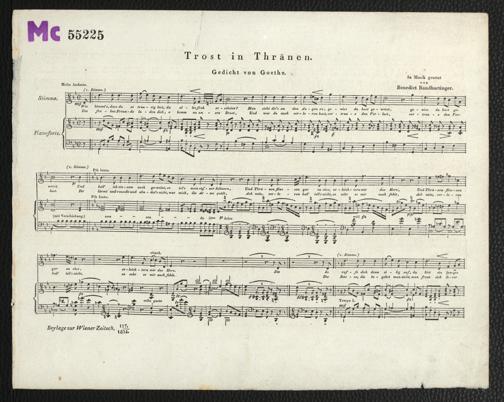 Trost in Thränen : [für Pianoforte mit überlegter Singstimme] / In Musik gesetzt von Benedict Randhartinger. [Gedicht] von Johann Wolfgang von Goethe. Strauss, [ohne Jahresangabe]. Wienbibliothek im Rathaus, Mc-55225, https://resolver.obvsg.at/urn:nbn:at:AT-WBR-132204 / Public Domain Mark 1.0