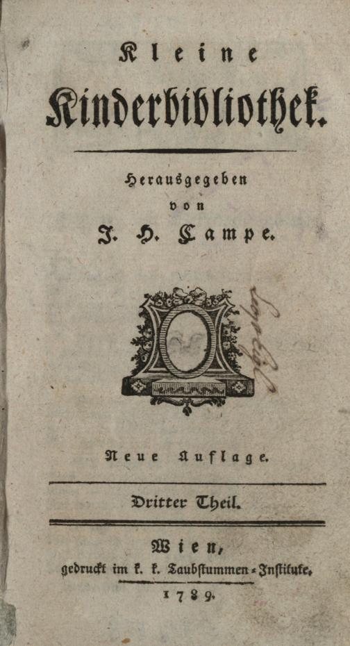 Kleine Kinderbibliothek. Kleine Kinderbibliothek / hrsg. von J. H. Campe. Wien : K. K. Taubstummeninstitut : 3-4 / hrsg. von J. H. Campe. Wien : K. K. Taubstummeninstitut, 1789. Wienbibliothek im Rathaus, A-313770, https://resolver.obvsg.at/urn:nbn:at:AT-WBR-136568 / Public Domain Mark 1.0