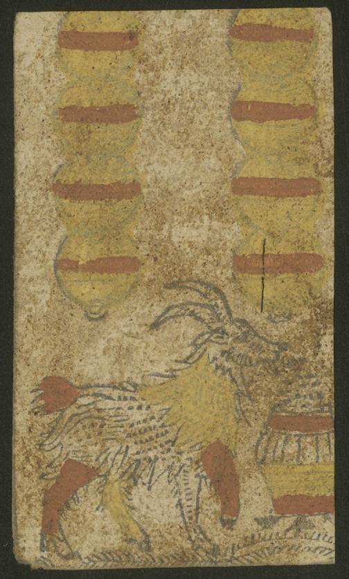 19 Bl. altkolor. Spielkarten-Fragmente (Einband-Makulatur), aufgefunden in einem dt. Katechismus (Mergentheim 1685; WBR, Sign. A-307609, AC11057171). - Vorh. Kartenbilder: Unter, Ober, Daus sowie vier Zahlenkarten mit Tierabbildungen (Krebs, Steinbock oder Ziege, Katze). - Rest eines Druckersignets mit der Initiale "P"