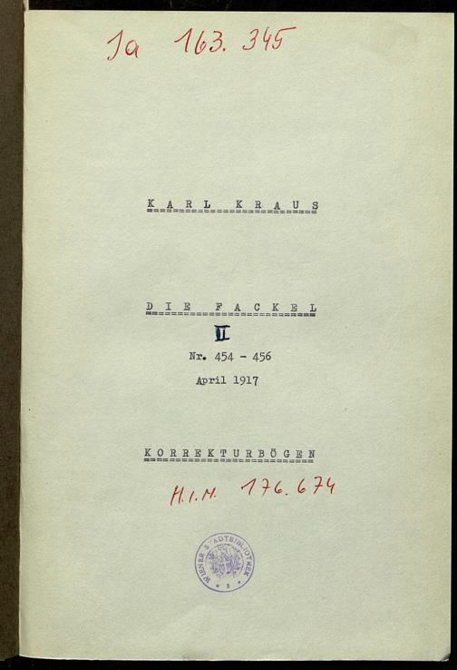 Kraus, Karl: Korrekturbögen von Karl Kraus zur Fackel Nr. 454/456. o.O., 1917.04.°°
