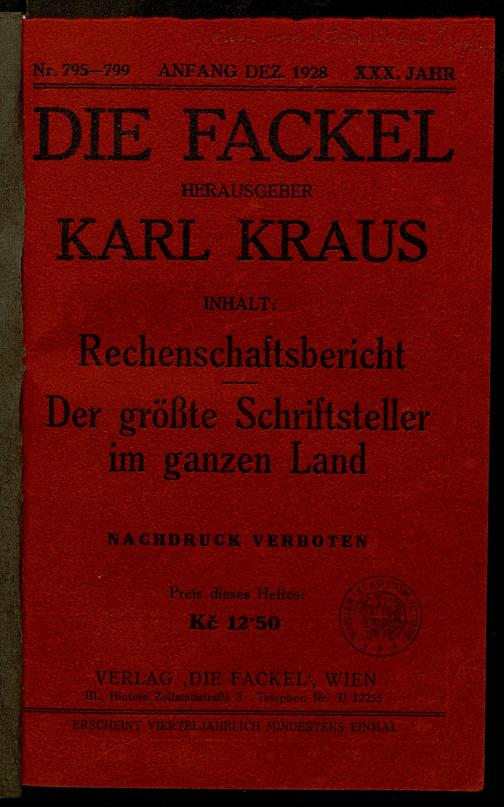 Kraus, Karl: Druckexemplar (letzter Umbruch) von Karl Kraus zur Fackel Nr. 795/799. o.O., 1928.12.°°. Wienbibliothek im Rathaus, H.I.N.-176761, https://resolver.obvsg.at/urn:nbn:at:AT-WBR-140831 / Public Domain Mark 1.0