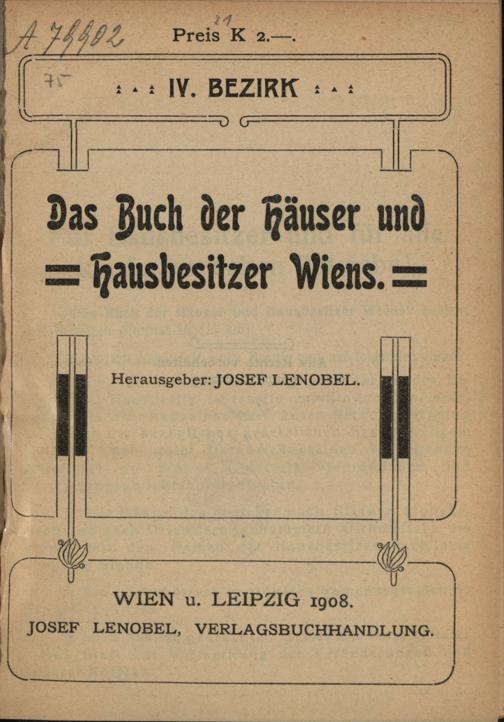 Das Buch der Häuser und Hausbesitzer Wiens. Das Buch der Häuser und Hausbesitzer Wiens / Hrsg.: Josef Lenobel. Wien [u.a.] : Lenobel : 4 / Hrsg.: Josef Lenobel. Wien [u.a.] : Lenobel, 1908. Wienbibliothek im Rathaus, A-79902, https://resolver.obvsg.at/urn:nbn:at:AT-WBR-142651 / Public Domain Mark 1.0