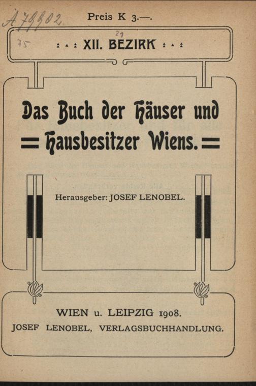 Das Buch der Häuser und Hausbesitzer Wiens. Das Buch der Häuser und Hausbesitzer Wiens / Hrsg.: Josef Lenobel. Wien [u.a.] : Lenobel : 12 / Hrsg.: Josef Lenobel. Wien [u.a.] : Lenobel, 1908. Wienbibliothek im Rathaus, A-79902, https://resolver.obvsg.at/urn:nbn:at:AT-WBR-143096 / Public Domain Mark 1.0