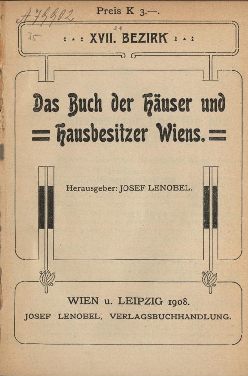 Das Buch der Häuser und Hausbesitzer Wiens. Das Buch der Häuser und Hausbesitzer Wiens / Hrsg.: Josef Lenobel. Wien [u.a.] : Lenobel : 17 / Hrsg.: Josef Lenobel. Wien [u.a.] : Lenobel, 1908. Wienbibliothek im Rathaus, A-79902, https://resolver.obvsg.at/urn:nbn:at:AT-WBR-143143 / Public Domain Mark 1.0