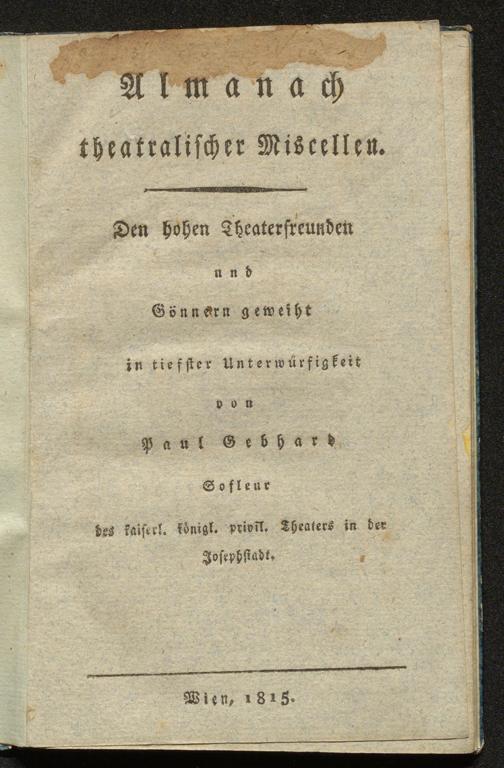 Almanach theatralischer Miscellen : Den hohen Theaterfreunden und Gönnern geweiht in tiefster Unterwürfigkeit / von Paul [...]