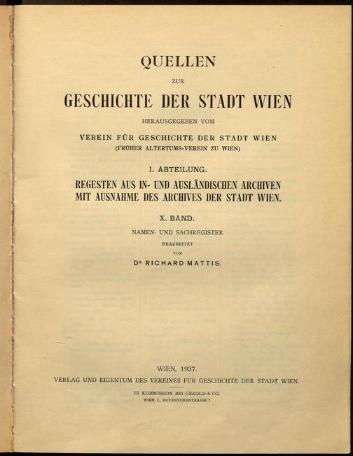 Quellen zur Geschichte der Stadt Wien. Namen- und Sachregister / bearb. von Richard Mattis / hrsg. vom Verein für Geschichte der Stadt Wien (früher Altertums-Verein zu Wien). Wien : Verl. d. Vereines für Geschichte der Stadt Wien : 1,10,R / hrsg. vom Verein für Geschichte der Stadt Wien (früher Altertums-Verein zu Wien). Wien : Verl. d. Vereines für Geschichte der Stadt Wien, 1937. Wienbibliothek im Rathaus,