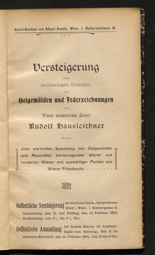 Versteigerung einer reichhaltigen Collection von Oelgemälden und Federzeichnungen des Wiener akademischen Malers Rudolf Hausleithner : [...]