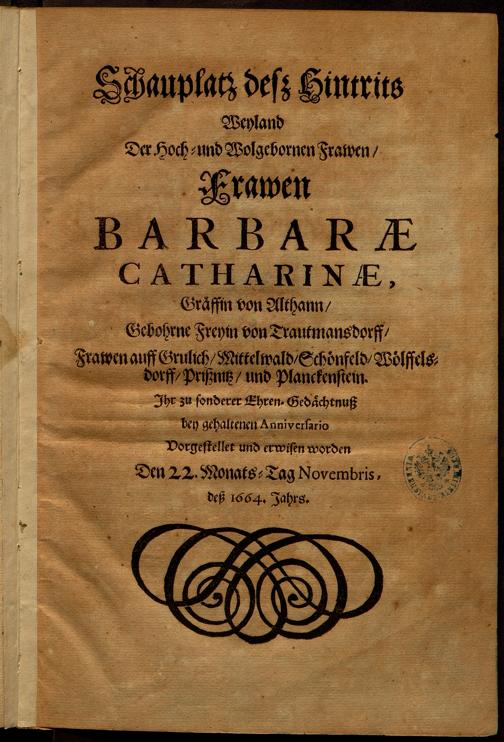 - PDF Schawplatz deß Lebens vnd Sterbens Weiland der Hoch- und Wolgebohrnen Frawen, Fr. Barbarae Catharinae, Gräffin von Althann