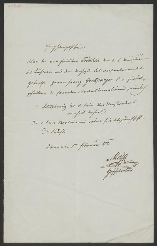 Empfangsschein des k.k. Ministerium des Äußeren über die Rückgabe ausländischer Ordensdekorationen. Wien, 1872. Wienbibliothek im Rathaus, H.I.N.-82367, https://resolver.obvsg.at/urn:nbn:at:AT-WBR-171892 / Public Domain Mark 1.0