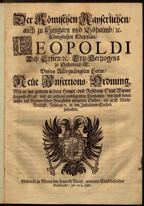 Der Römischen Kayserlichen, auch zu Hungarn und Böhaimb, [et]c. Königlichen Majestätt, Leopoldi Deß Ersten, [et]c. Ertz-Hertzogens zu Oesterreich, etc. Unsers Allergnädigsten Herrn, Neüe Infections-Ordnung : Wie es ins gemein in dero Haupt- und Residentz-Statt Wienn, Leopold-Statt, und all anderen umbligenden Vorstätten, wie auch denen ausser deß Wiennerischen Burgfrids gelegenen Orthen, als zu S. Ulrich, Neüstifft, Neübau, [et]c. in den Infections-Sachen zuhalten ; [Geben in Unserer Statt Wienn, den Neundten Januarij, im Sechzehenhundert, Neun und Sibentzigisten ... Jahr.]