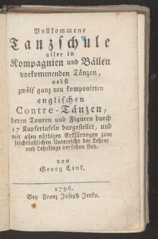 Vollkommene Tanzschule aller in Kompagnien und Bällen vorkommenden Tänzen : nebst zwölf ganz neu komponirten englischen Contre-Tänzen, [...]