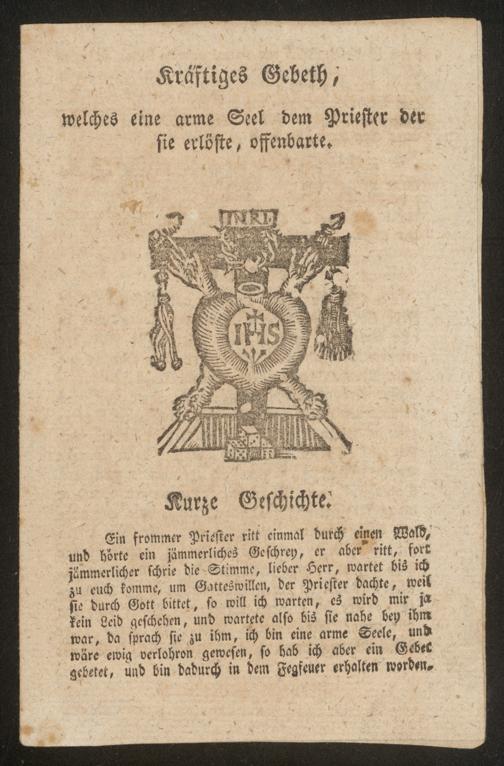 Kräftiges Gebeth, welches eine arme Seel dem Priester der sie erlöste, offenbarte : Kurze Geschichte. [S.l.], [ca. 1800]. Wienbibliothek im Rathaus, E-367074, https://resolver.obvsg.at/urn:nbn:at:AT-WBR-249833 / Public Domain Mark 1.0