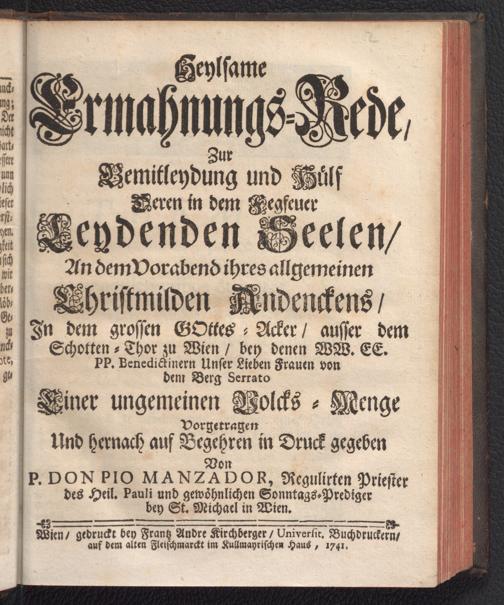 Heylsame Ermahnungs-Rede, Zur Bemitleydung und Hülf Deren in dem Fegfeuer Leydenden Seelen : An dem Vorabend ihres allgemeinen Christmilden Andenckens, In dem grossen Gottes-Acker, ausser dem Schotten-Thor zu Wien, bey denen WW. EE. PP. Benedictinern [...] / Von P. Don Pio Manzador, Regulirten Priester des Heil. Pauli und gewöhnlichen Sonntags-Prediger bey St. Michael in Wien. Wien : gedruckt bey Frantz Andre Kirchberger, 1741. Wienbibliothek im Rathaus,