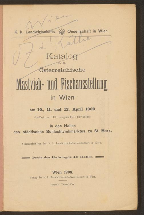 Katalog für die österreichische Mastvieh- und Fischausstellung in Wien am 10., 11. und 12. April 1908 : geöffnet von 9 Uhr [...]