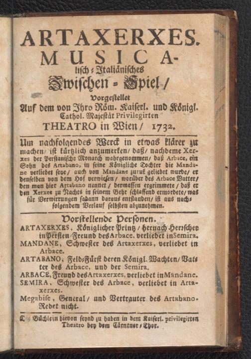 Artaxerxes : Musicalisch-Italiänisches Zwischen-Spiel, Vorgestellet Auf dem von Ihro Röm. Kaiserl. und Königl. Cathol. Majestät Privilegirten Theatro in Wien, 1732. [Wien] : in dem Kaiserl. privilegirten Theatro bey dem Cärntner-Thor ; [Wien] : [Johann Leopold van Ghelen] ; [Wien] : [1732], [1732]. Wienbibliothek im Rathaus,