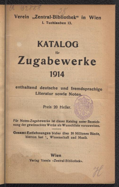 Katalog für Zugabewerke 1914 : enthaltend deutsche und fremdsprachige Literatur sowie Noten / Verein "Zentral-Bibliothek" [...]