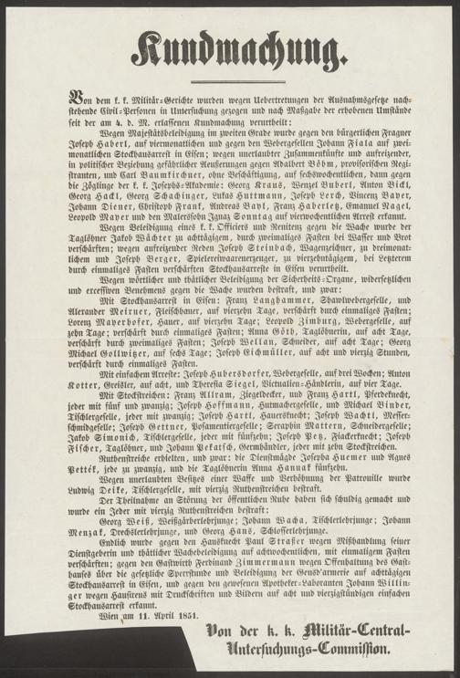 Kundmachung [Wien, 11. April 1851] : Von dem k.k. Militär-Gerichte wurden wegen Uebertretungen der Ausnahmsgesetze nachstehende Civil-Personen in Untersuchung gezogen und nach Maßgabe der [...] / Von der k. k. Militär-Central-Untersuchungs-Commission. [Wien] : Aus der k. k. Hof- und Staatsdruckerei, 1851. Wienbibliothek im Rathaus, Rb-5076, https://resolver.obvsg.at/urn:nbn:at:AT-WBR-576810 / Public Domain Mark 1.0