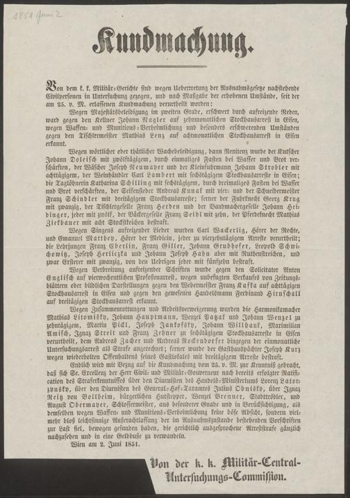 Kundmachung [Wien, 2. Juni 1851] : Von dem k.k. Militär-Gerichte sind wegen Uebertretungen der Ausnahmsgesetze nachstehende Civilpersonen in Untersuchung gezogen, und nach Maßgabe der erhobenen Umstände, seit der am 25. v. M. erlassenen Kundmachung verurtheilt worden: ... ; Wien am 2. Juni 1851 / Von der k. k. Militär-Central-Untersuchungs-Commission