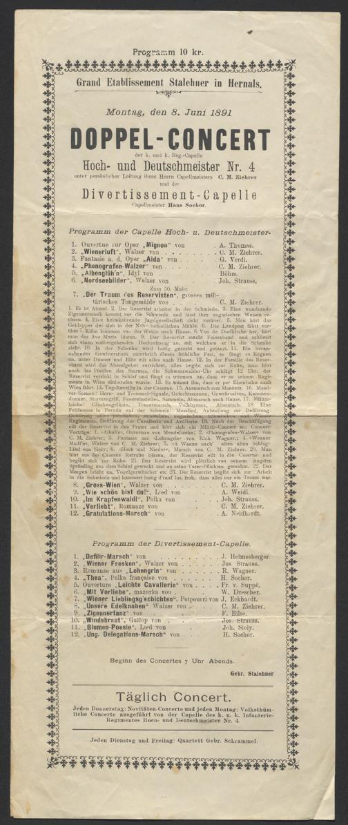 Montag, den 8. Juni 1891: Doppel-Concert der k. und k. Reg.-Capelle Hoch- und Deutschmeister Nr. 4 unter persönlicher Leitung ihres Herrn Capellmeisters [...] / Grand Etablissement Stalehner in Hernals. [Wien], [1891]. Wienbibliothek im Rathaus, C-48077, https://resolver.obvsg.at/urn:nbn:at:AT-WBR-577135 / Public Domain Mark 1.0