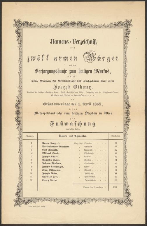 - QuellenangabeNamens-Verzeichniß der zwölf armen Bürger aus dem Versorgungshause zum heiligen Markus, welche Seine Eminenz ... Joseph Othmar, Kardinal der heiligen römischen [...]. [Wien] : Druck von Ferd. Ullrich, 1.4.1858. Wienbibliothek im Rathaus, E-47765, https://resolver.obvsg.at/urn:nbn:at:AT-WBR-578719 / Public Domain Mark 1.0