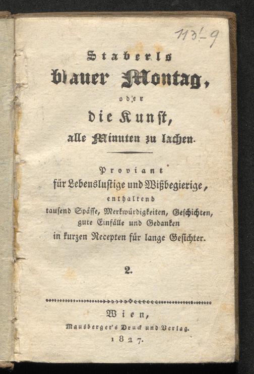 Staberls blauer Montag, oder die Kunst, alle Minuten zu lachen : Proviant für Lebenslustige und Wißbegierige, enthaltend tausend Spässe, Merkwürdigkeiten, geschichten, gute Einfälle und Gedanken in kurzen Recepten für [...]. Wien : Mausberger. Wienbibliothek im Rathaus, https://resolver.obvsg.at/urn:nbn:at:AT-WBR-581858 / Public Domain Mark 1.0