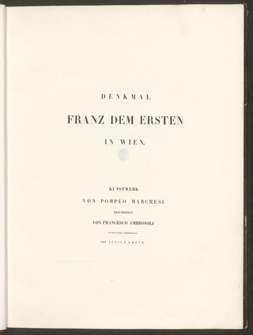 Monumento a Francesco Primo in Vienna : opera di Pompeo Marchesi = Denkmal Franz dem Ersten in Wien : Kunstwerk von Pompeo Marchesi = Monument a Francois Premier à Vienne : oeuvre de Pompèe [...] / ,Francesco Ambrosoli ; in deutscher Übertragung von Julius Krone. Milano : [Verlag nicht ermittelbar] ; Milano : R. Carpan, [1846?]. Wienbibliothek im Rathaus,