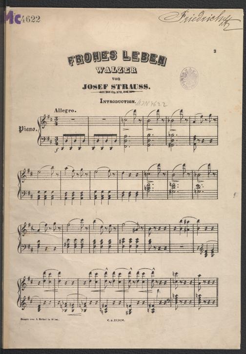 Frohes Leben : Walzer ; [f. Pfte. 2 hdg.] ; Op. 272 / von Josef Strauss. Wien : Spina, [ohne Jahresangabe]. Wienbibliothek im Rathaus, Mc-4622, https://resolver.obvsg.at/urn:nbn:at:AT-WBR-680147 / Public Domain Mark 1.0