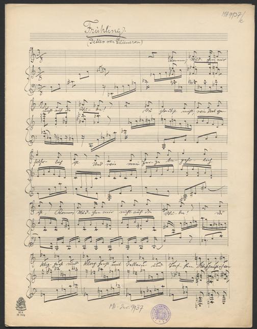 Frühling (Detlev von Liliencron) : [Lied für eine Singstimme mit Klavierbegleitung] ; [op.6, Nr.4] / [von Oskar C. Posa]. [ohne Jahresangabe]. Wienbibliothek im Rathaus, MHc-9937, https://resolver.obvsg.at/urn:nbn:at:AT-WBR-700930 / Public Domain Mark 1.0