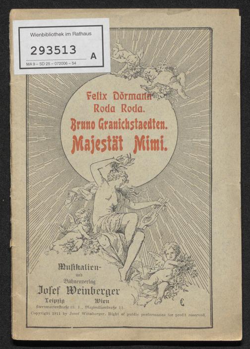 Majestät Mimi : Operette in drei Akten / von Felix Dörmann und Roda Roda. Musik von Bruno Granichstaedten. Leipzig : Weinberger, 1911. Wienbibliothek im Rathaus, A-293513, https://resolver.obvsg.at/urn:nbn:at:AT-WBR-707037 / Public Domain Mark 1.0