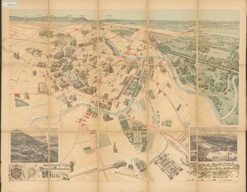 Monumental-Plan der Haupt- und Residenzstadt Wien : vom Arsenal bis zum Kahlenberg - von der Sternwarte bis zu den Kaisermühlen, nebst einer Beschreibung der Stadt und ihrer Umgebung. Wien : Gerold, 1890. Wienbibliothek im Rathaus, k-195970, https://resolver.obvsg.at/urn:nbn:at:AT-WBR-881345 / Public Domain Mark 1.0