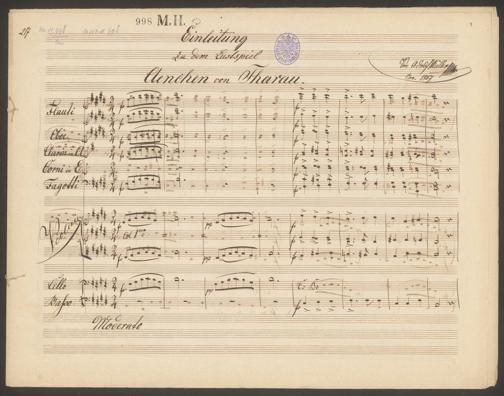 Einleitung zu dem Lustspiel: Aenchen von Tharau / [für Orchester komponiert von Adolf Müller]. Nov. 1857. Wienbibliothek im Rathaus, MHc-998, https://resolver.obvsg.at/urn:nbn:at:AT-WBR-913650 / Public Domain Mark 1.0