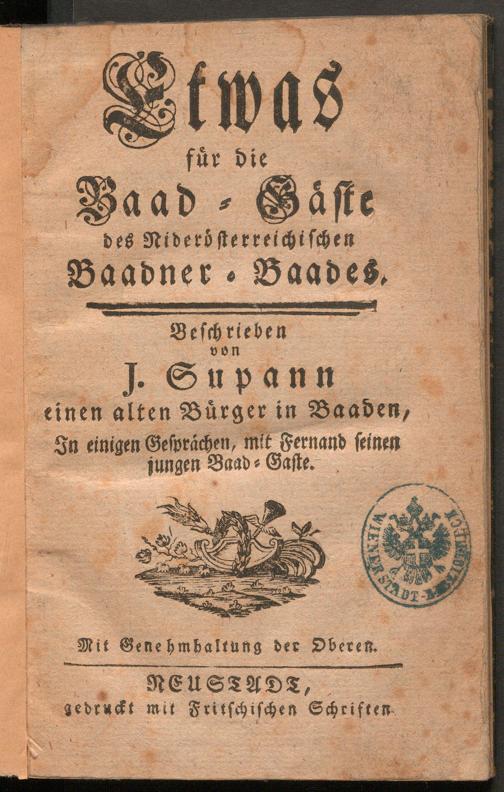 Etwas für die Baad-Gäste des Niderösterreichischen Baadner-Baades : In einigen Gesprächen, mit Fernand seinen jungen Baad-Gaste / Beschrieben von J. Supann. Neustadt : gedruckt mit Fritschischen Schriften, [ca. 1790]. Wienbibliothek im Rathaus, A-4973, https://resolver.obvsg.at/urn:nbn:at:AT-WBR-1012378 / Public Domain Mark 1.0