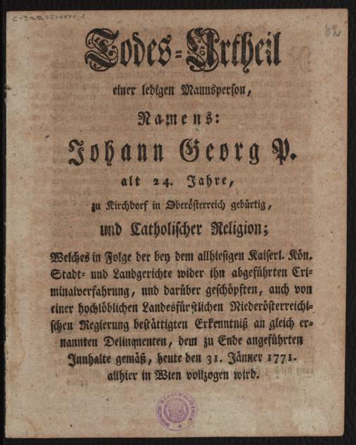 - QuellenangabeTodes-Urtheil einer ledigen Mannsperson, Namens: Johann Georg P. alt 24. Jahre, zu Kirchdorf in Oberösterreich gebürtig, und Catholischer Religion : Welches in Folge der bey dem allhiesigen Kaiserl. Kön. Stadt- und Landgerichte wider ihn abgeführten Criminalverfahrung ... heute den 31. Jänner 1771. [...]. [S.l.] : [S.n.], 1771. Wienbibliothek im Rathaus, C-39975, https://resolver.obvsg.at/urn:nbn:at:AT-WBR-12013 / Public Domain Mark 1.0