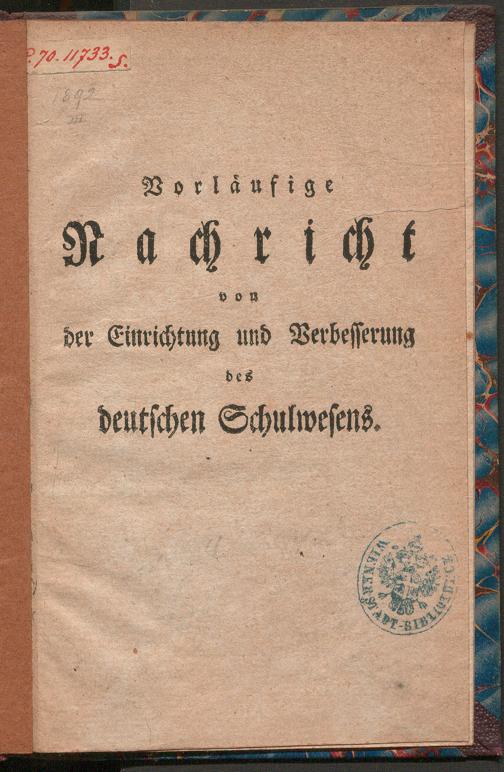 Vorläufige Nachricht von der Einrichtung und Verbesserung des deutschen Schulwesens. Wien : [o.V.], 1774. Wienbibliothek im Rathaus, A-1436, https://resolver.obvsg.at/urn:nbn:at:AT-WBR-1056089 / Public Domain Mark 1.0