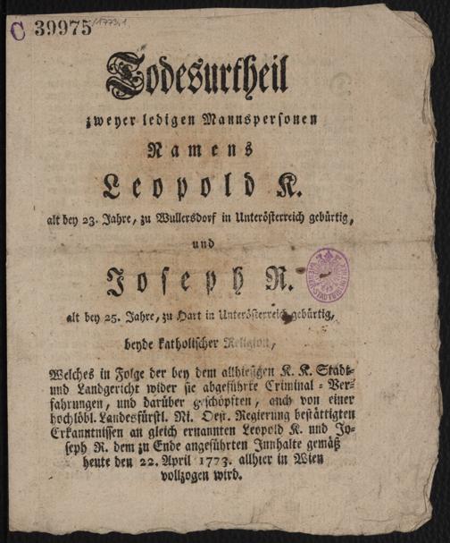 - QuellenangabeTodesurtheil zweyer ledigen Mannspersonen Namens Leopold K. alt bey 23. Jahre, zu Wullersdorf in Unterösterreich gebürtig, und Joseph R. als bey 25. Jahre, [...] : Welches in Folge der bey dem allhiesigen K. K. Stadt- und Landgericht wider sie abgeführte Criminal-Verfahrungen ... dem zu Ende geführten Innhalte gemäß [...]. [S.l.] : [s.n.], 1773. Wienbibliothek im Rathaus, C-39975, https://resolver.obvsg.at/urn:nbn:at:AT-WBR-12145 / Public Domain Mark 1.0