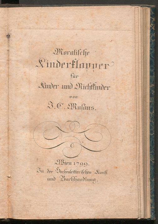 Moralische Kinderklapper für Kinder und Nichtkinder / von J.C. Musäus. Wien : Hohenleither, 1799