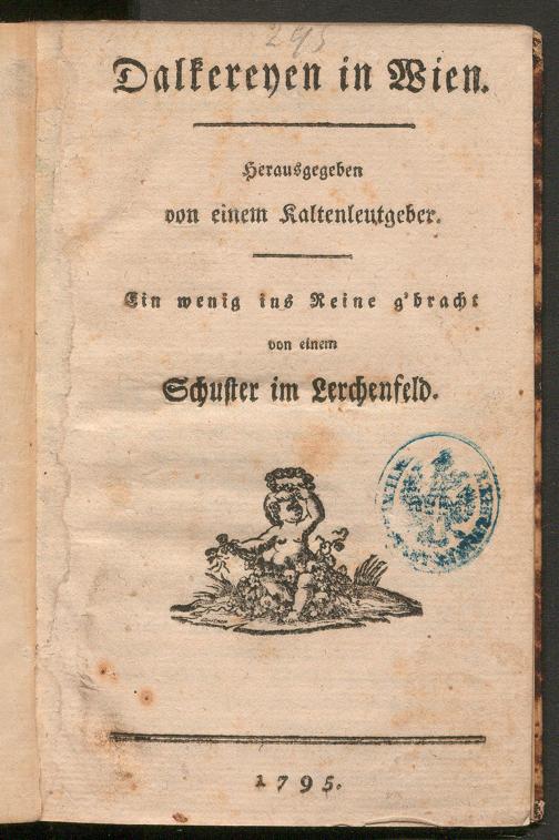 Dalkereyen in Wien / Herausgegeben von einem Kaltenleutgeber. Ein wenig ins Reine g'bracht von einem Schuster im Lerchenfeld. [Wien], 1795. Wienbibliothek im Rathaus, A-9457, https://resolver.obvsg.at/urn:nbn:at:AT-WBR-1123253 / Public Domain Mark 1.0