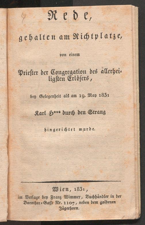 Rede, gehalten am Richtplatze von einem Priester der Congregation des allerheiligsten Erlösers, bey Gelegenheit als am 19. May 1831 Karl H*** durch den [...]. Wien : im Verlage bey Franz Wimmer, 1831. Wienbibliothek im Rathaus, A-3802, https://resolver.obvsg.at/urn:nbn:at:AT-WBR-1123569 / Public Domain Mark 1.0