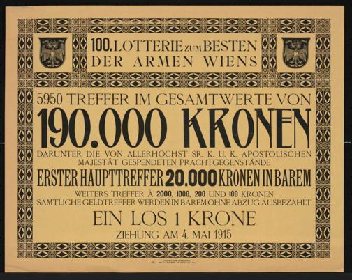 100. Lotterie zum Besten der Armen Wiens. 5950 Treffer im Gesamtwerte von 190.000 Kronen ... Ein Los 1 Krone. Ziehung am 4. Mai 1915. Wien : Jos. Eberle & Co., 1915. Wienbibliothek im Rathaus, P-36149 ; PS-A2-0016, https://resolver.obvsg.at/urn:nbn:at:AT-WBR-20107 / Public Domain Mark 1.0