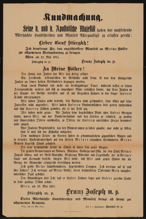 Kundmachung. Seine k. und k. Apolostolische Majestät ... Lieber Graf Stürgkh ... Franz Joseph ... [24. Mai 1915]. Linz : Zentaldruckerei, 1915. Wienbibliothek im Rathaus, P-226558 ; PS-A0-0014, https://resolver.obvsg.at/urn:nbn:at:AT-WBR-22847 / Public Domain Mark 1.0