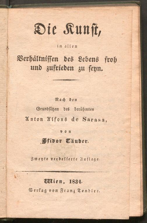 Die Kunst in allen Verhältnissen des Lebens froh und zufrieden zu seyn / nach den Grundsätzen des berühmten Anton Alfons de Sarasa, von Isidor Täuber. Wien : Tendler, 1834. Wienbibliothek im Rathaus, A-8183, https://resolver.obvsg.at/urn:nbn:at:AT-WBR-1124960 / Public Domain Mark 1.0