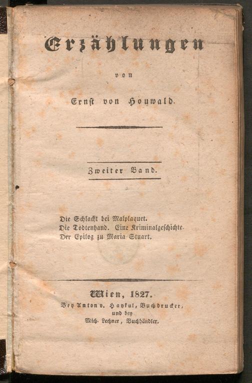 Erzählungen. Erzählungen / von Ernst von Houwald. Wien : bey Anton v. Haykul und bey Mich. Lechner, 1827-1827 : 2 / von Ernst von Houwald. Wien : bey Anton v. Haykul und bey Mich. Lechner, 1827. Wienbibliothek im Rathaus, A-8011, https://resolver.obvsg.at/urn:nbn:at:AT-WBR-1125626 / Public Domain Mark 1.0