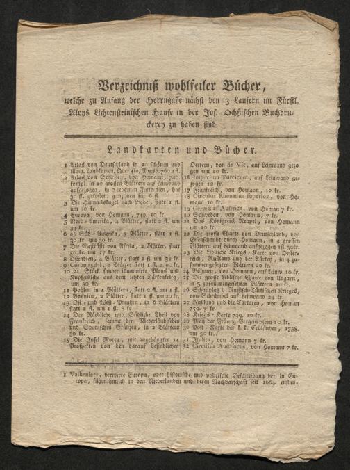 Verzeichniß wohlfeiler Bücher, welche zu Anfang der Herrngasse nächst den 3 Laufern im Fürstl. Aloys Lichtensteinischen Hause in der Jos. Ochßischen Buchdruckerey [...]. [S.l. Wien] : [Joseph Ochß], [s.a. ca. 1795]. Wienbibliothek im Rathaus, E-377712, https://resolver.obvsg.at/urn:nbn:at:AT-WBR-1126778 / Public Domain Mark 1.0
