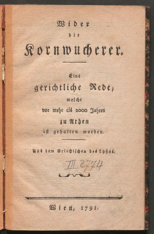 Wider die Kornwucherer : eine gerichtliche Rede, welche vor mehr als 2000 Jahren zu Athen ist gehalten worden / aus dem Griechischen des Lysias. Wien, 1791. Wienbibliothek im Rathaus, A-2774, https://resolver.obvsg.at/urn:nbn:at:AT-WBR-1128366 / Public Domain Mark 1.0