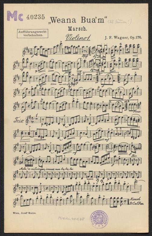 Wagner, Joseph Franz: Weana Buam : Marsch ; op. 176 ; [für Orchester]. Wien : Blaha, [ohne Jahresangabe]. Wienbibliothek im Rathaus, Mc-40235, https://resolver.obvsg.at/urn:nbn:at:AT-WBR-1130124 / Public Domain Mark 1.0