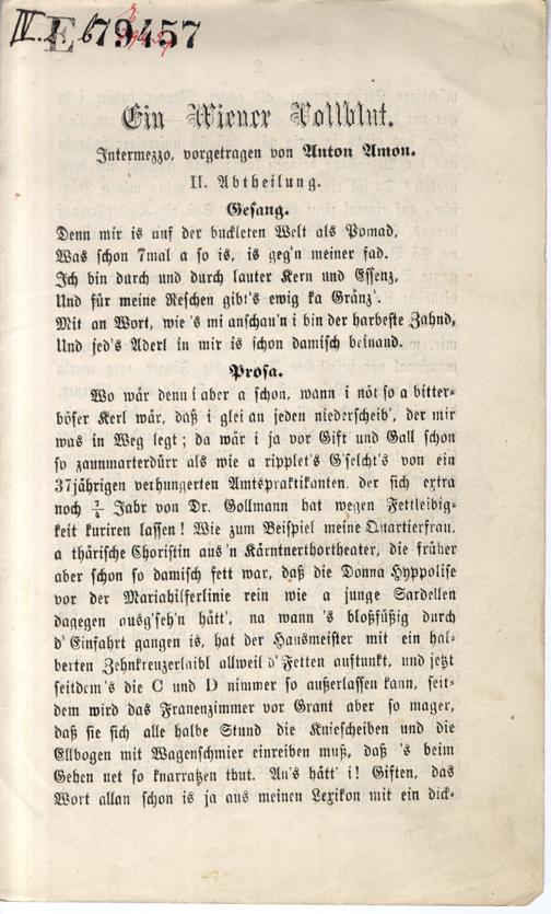 Ein Wiener Vollblut : Intermezzo ; II. Abtheilung / vorgetragen von Anton Amon. Wien : M. Moßbeck, [ca. 1870]. Wienbibliothek im Rathaus, E-79457, https://resolver.obvsg.at/urn:nbn:at:AT-WBR-1131049 / Public Domain Mark 1.0