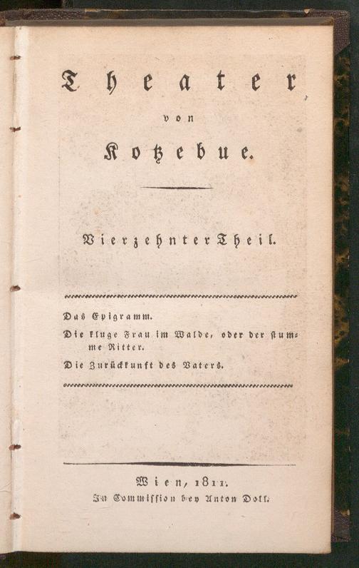 Theater. <<Das>> Epigramm : Die kluge Frau im Walde, oder der stumme Ritter : Die Zurückkunst des Vaters / von Kotzebue. Wien : In Commission bey Anton Doll : 14 / von Kotzebue. Wien : In Commission bey Anton Doll, 1811. Wienbibliothek im Rathaus, A-8250, https://resolver.obvsg.at/urn:nbn:at:AT-WBR-1248734 / Public Domain Mark 1.0