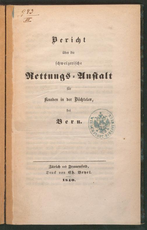 Bericht über die schweizerische Rettungs-Anstalt für Knaben in der Bächtelen, bei Bern. Zürich ; Frauenfeld : Druck von Ch. [...]