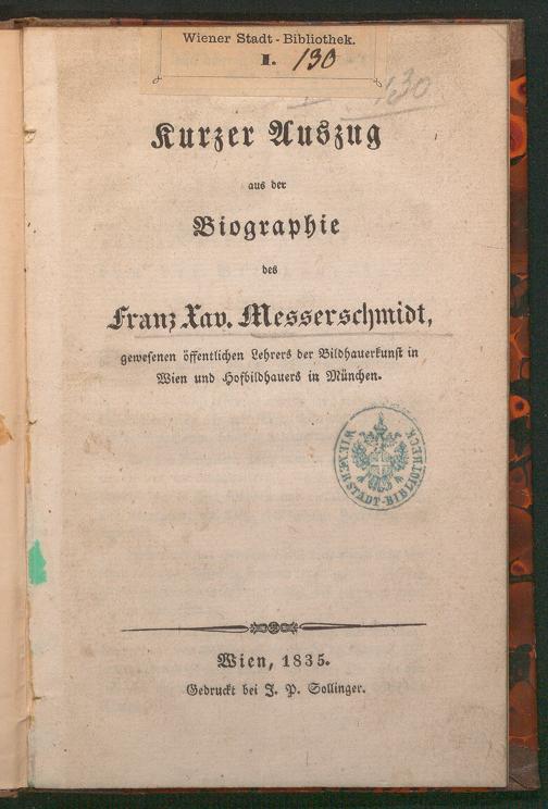 Kurzer Auszug aus der Biographie des Franz Xav. Messerschmidt : gewesenen öffentlichen Lehrers der Bildhauerkunst in Wien und Hofbildhauers in München. Wien : Gedruckt bei J. P. Sollinger, 1835. Wienbibliothek im Rathaus, A-9354, https://resolver.obvsg.at/urn:nbn:at:AT-WBR-1250349 / Public Domain Mark 1.0